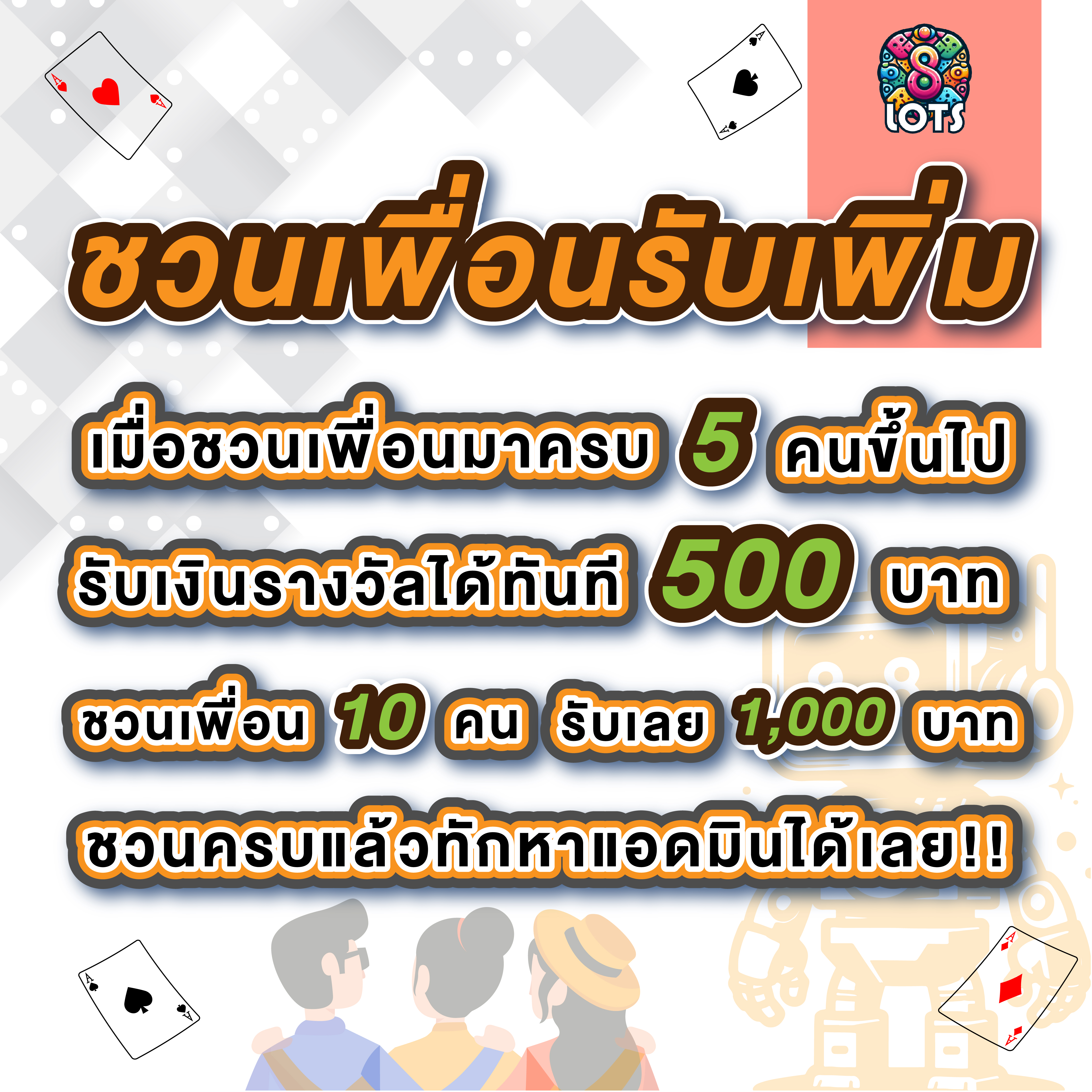 8LOTS เว็บพนันออนไลน์ที่ใจดีมีโปรโมชั่นมากมายให้สมาชิกทุกท่านได้เลือกรับกันอย่างจุใจ โดยเฉพาะสมาชิกใหม่ที่เพิ่งสมัครเข้ามา เราขอต้อนรับด้วยโบนัสสุดพิเศษถึง 100% สำหรับการฝากครั้งแรก ซึ่งคุณสามารถนำไปใช้เดิมพันได้ทั้งคาสิโนสด สล็อต กีฬา และเกมอื่นๆ อีกมากมาย