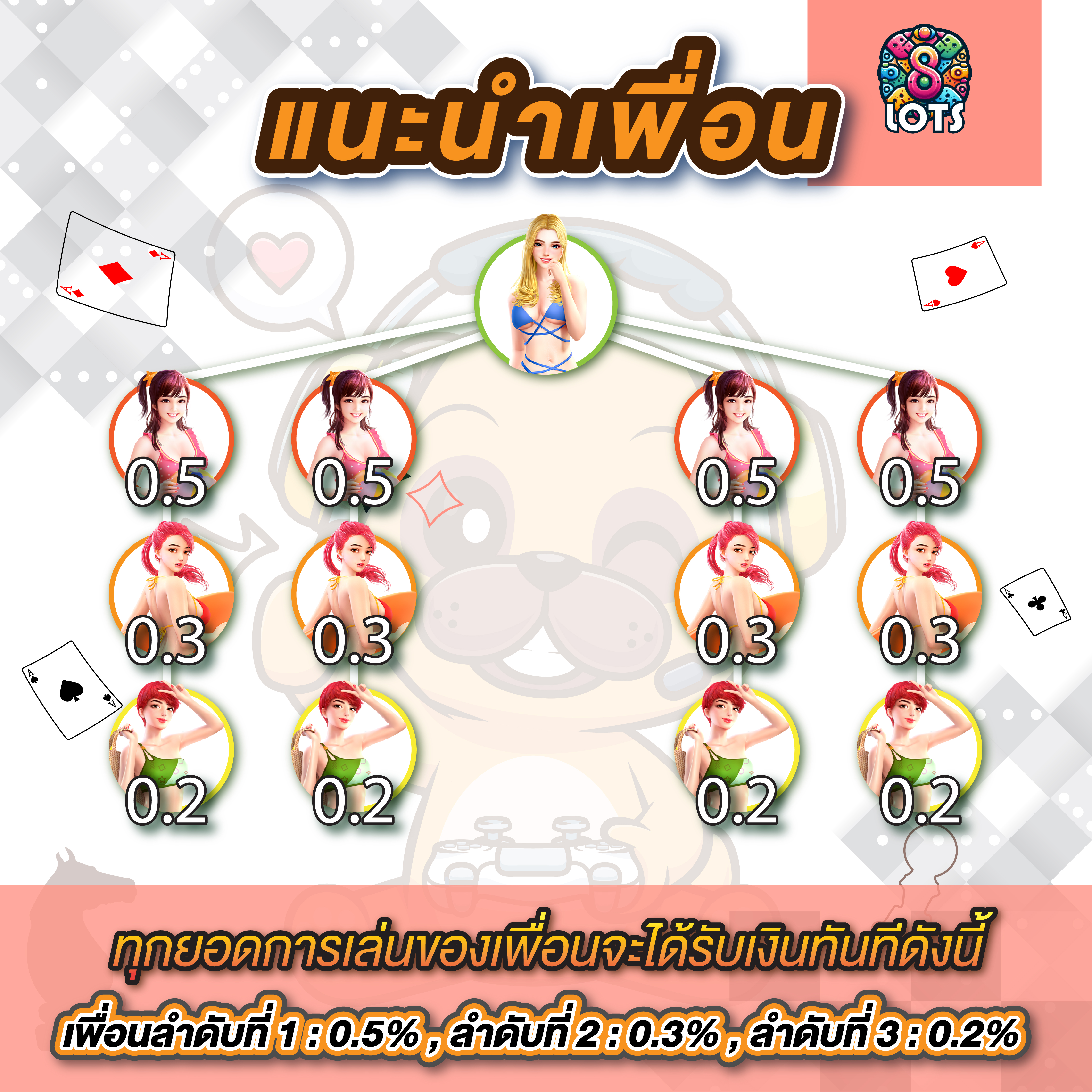 ที่ 8LOTS คุณจะได้พบกับดีลเลอร์มืออาชีพที่ผ่านการฝึกอบรมมาอย่างดี พร้อมให้บริการตลอด 24 ชั่วโมง ไม่ว่าคุณจะเข้ามาเล่นเวลาไหน ก็มั่นใจได้ว่าจะได้รับประสบการณ์การเล่นที่สมจริงและน่าตื่นเต้น ดีลเลอร์แต่ละคนมีความเป็นมืออาชีพสูง เป็นกันเอง และพร้อมช่วยเหลือผู้เล่นตลอดเวลา